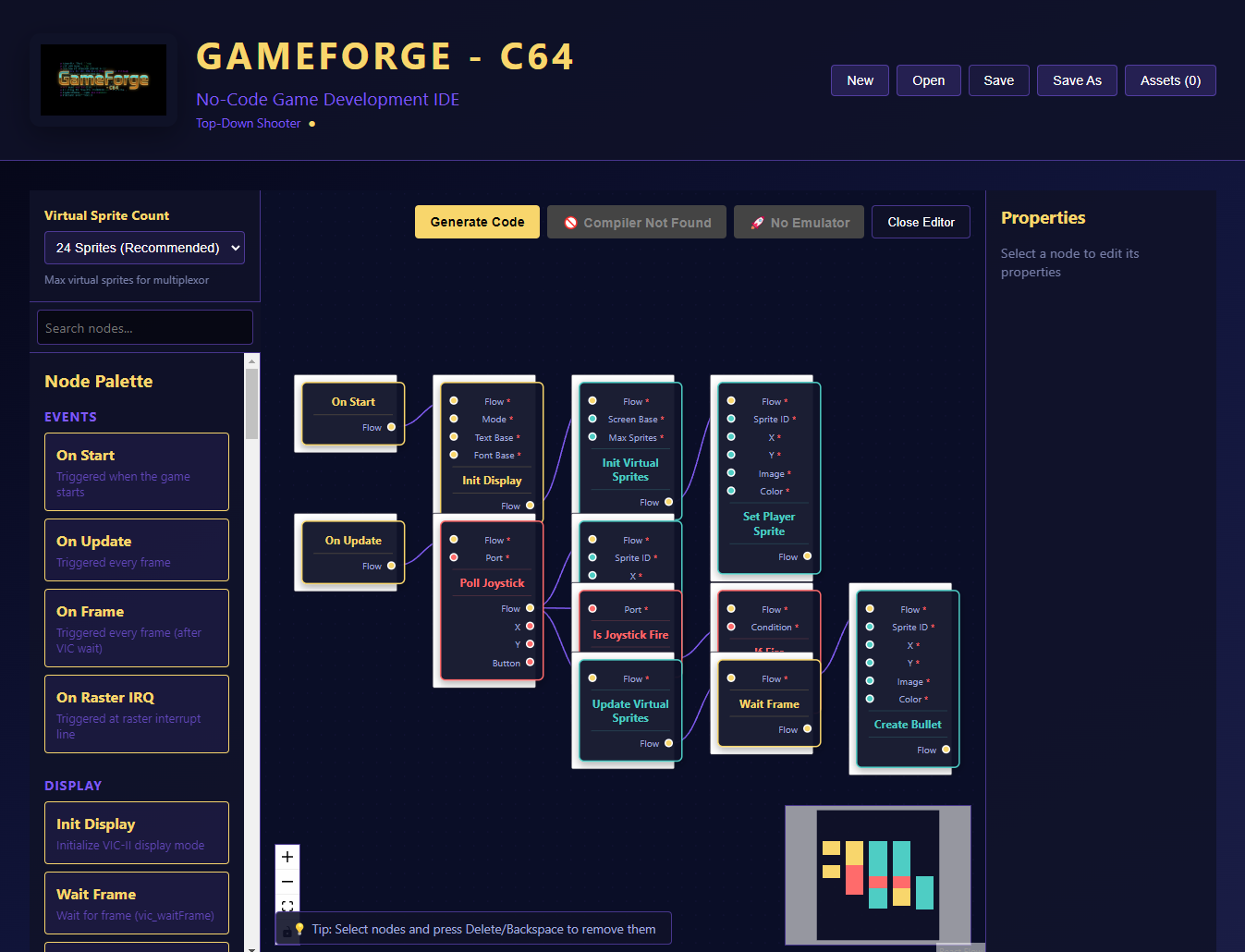 - Visual Script Editor: Drag nodes, set sprite multiplexor counts, and prep Oscar64-friendly code from the same UI.