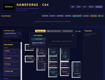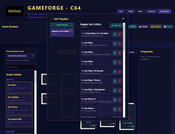GameForge‑64 is our retro creation suite for composers and homebrew devs. Browse 60k+ HVSC tracks, build playlists with auto-advance, and sketch gameplay logic in a node editor—everything in one sleek desktop app.