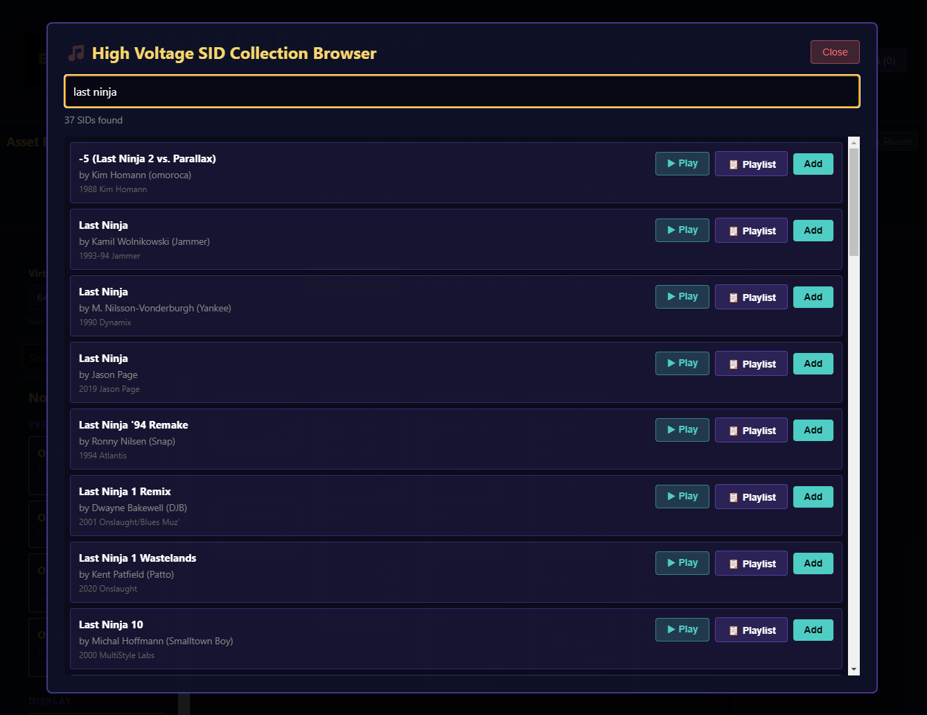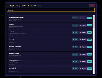 Early research build. SID playback, playlists, favorites, and the visual scripting canvas are live. Known quirks: stop/play resets, Next/Prev edge cases, and React Flow yelling about “custom” nodes. Compiler/emulator detection still needs polish in Electron.