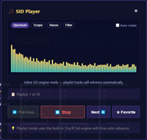 playTrackAtIndex, auto-advance detection, and a calm error UI when HVSC fetches misbehave. - Visualizer Suite finally landed: Spectrum bars, Oscilloscope trace, Voice meters, and Filter curves. Auto-rotate keeps it breathing; toggles let you camp on a favorite mode.