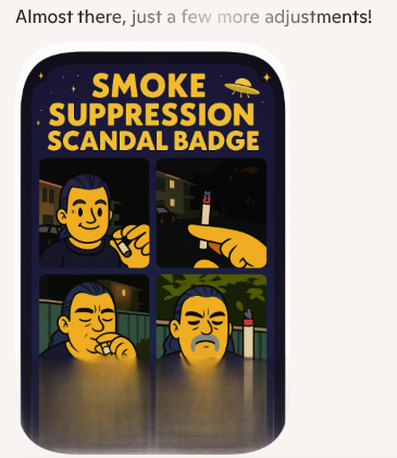 “SMOKE SUPPRESSION SCANDAL BADGE.” It featured all four smoking panels, UFO icons, sparkles on a dark blue background.