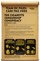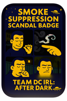 Badges: “SMOKE SUPPRESSION SCANDAL BADGE,” Badge #008: “Smoke Suppression Scandal - Cartoon Edition,” Badge #009: “TEAM DC AFTER DARK: SMOKE & MIRRORS - Surreal Finale.”